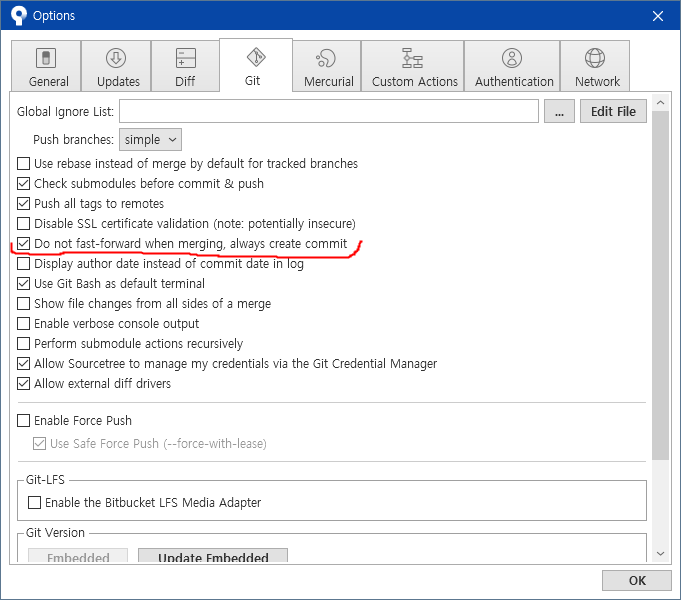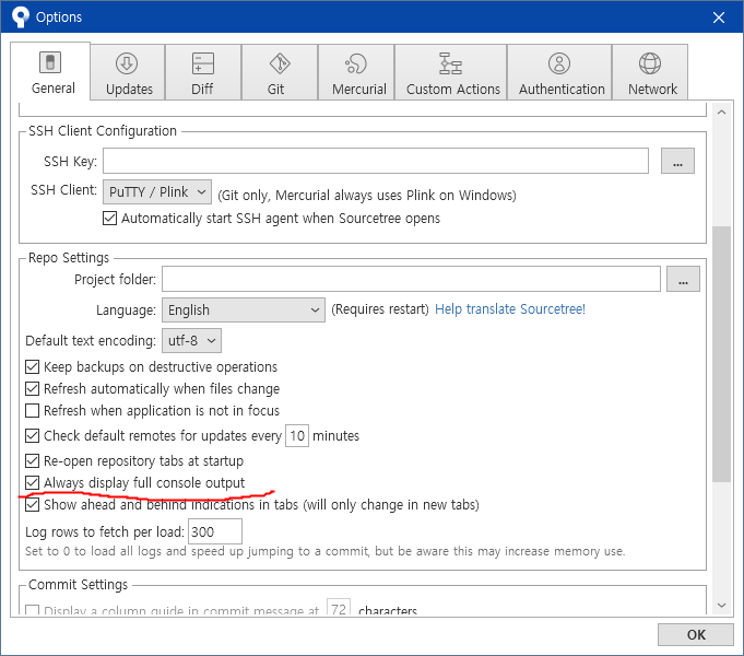 - sourceTree 상단 메뉴 > Tools > Options > Git
